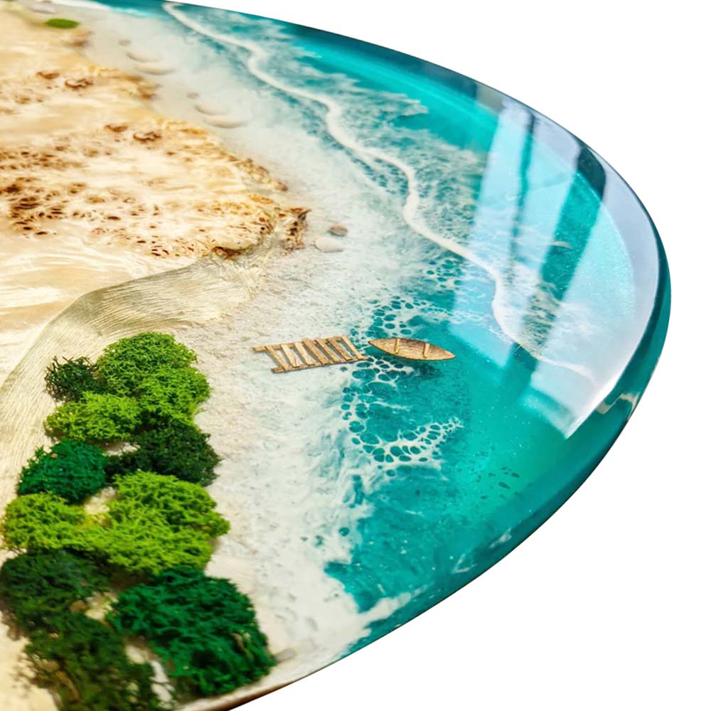 This round tabletop showcases a meticulously crafted island - beach scene. The poplar wood, with its smooth, light - beige surface and natural brown speckles, forms the shape of a small island. Surrounding it, layers of epoxy resin in varying shades of turquoise and blue simulate the ocean, with white resin details mimicking foamy waves lapping at the shore. Embedded elements like a starfish, tiny boats, and miniature greenery (to represent vegetation) along with small shells scattered on the “beach” (the white resin areas near the wood) complete the coastal paradise pattern, creating a 3D - like, immersive tropical island landscape.