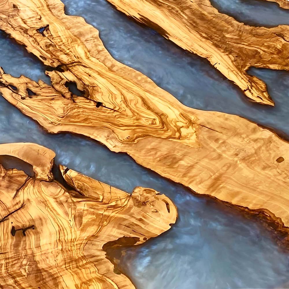 The round tabletop showcases a captivating natural-inspired pattern. Pieces of olive wood, with their warm, golden-brown tones and uniquely contoured, flowing grain, are set against a smooth epoxy resin background. The irregular, organic shapes of the olive wood, resembling scattered landmasses or drifting wooden fragments, create a dynamic contrast with the resin’s even, tranquil expanse. This combination forms an eye-catching, nature-evoking mosaic, as if depicting a serene, water-filled landscape dotted with rustic wooden islets, blending the wood’s earthy charm with the resin’s modern sleekness.