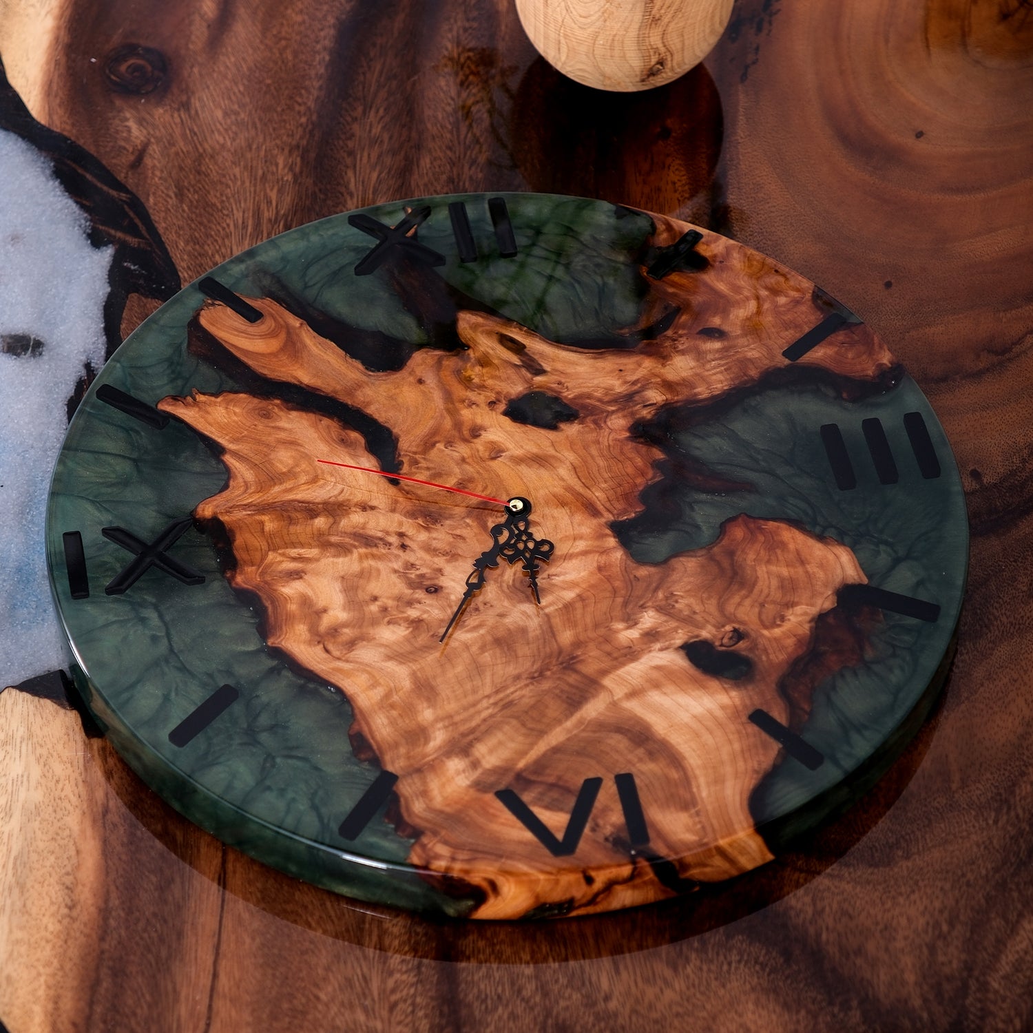 With a burl wood base boasting unique grain patterns, this round wall clock is encircled by a teal epoxy resin. The black Roman numerals and red clock hands create a vivid contrast, making it a functional and decorative addition to any room, blending nature - inspired aesthetics with modern design.