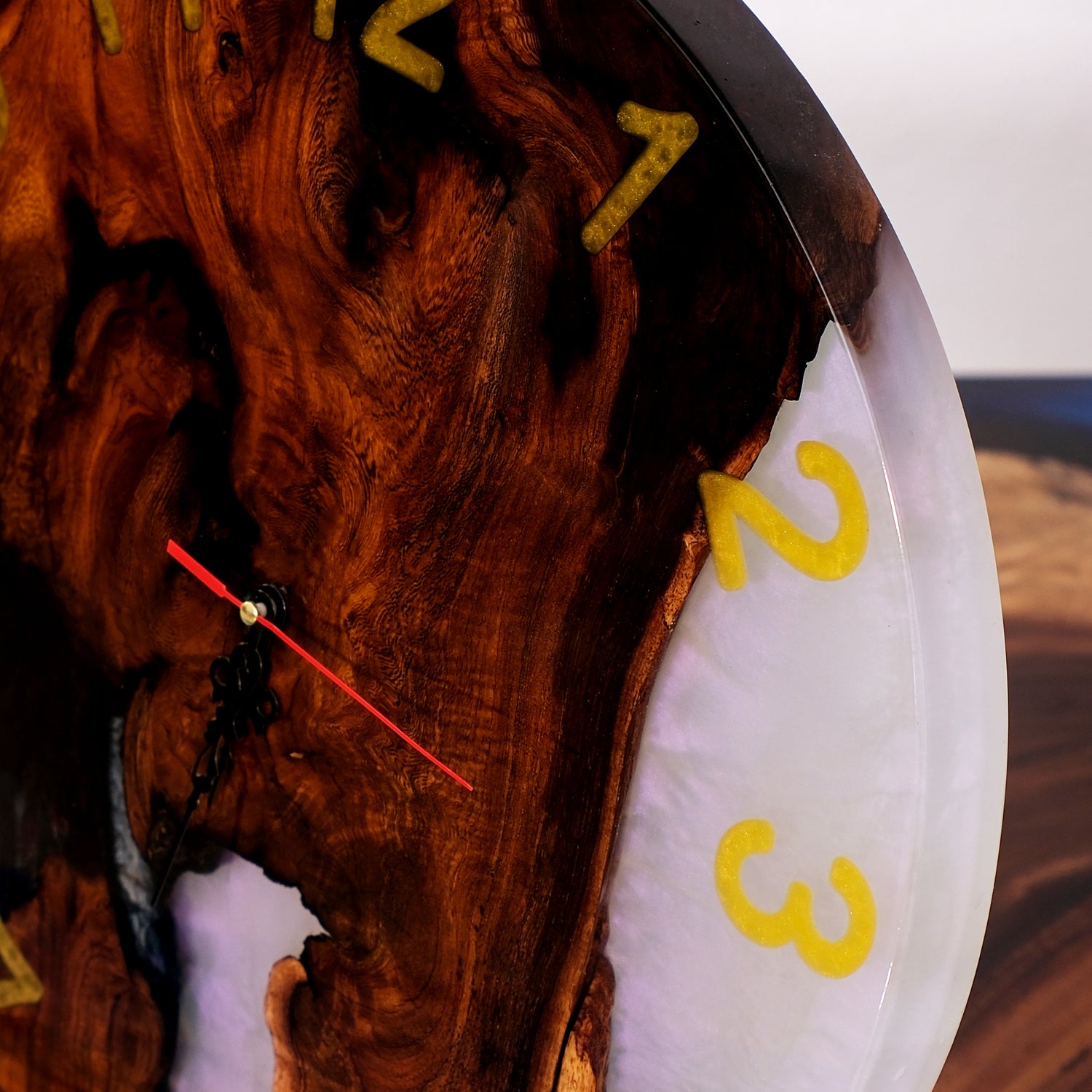 Each clock is meticulously handcrafted using natural wood, showcasing its distinctive grain patterns, combined with vibrant epoxy resin that creates a truly individual piece of functional art.