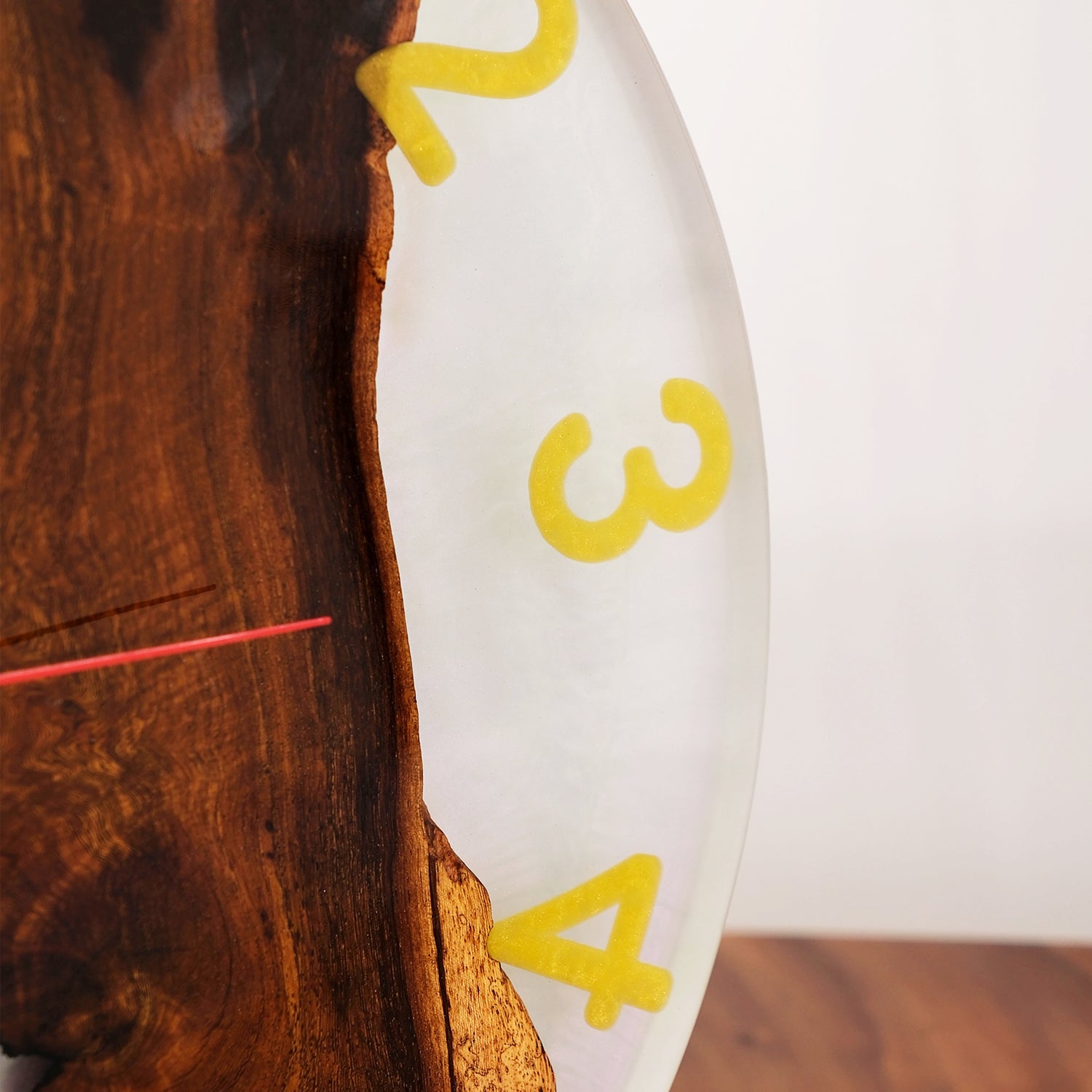 The clock face presents a bold and artistic pattern. A piece of black walnut wood, with its rich, dark - brown hues and intricate grain patterns, is set against a background of purple epoxy resin. The black walnut wood's irregular shape contrasts strikingly with the smooth, flowing surface of the purple resin. Yellow numerals are placed around the edge of the clock face, providing a clear and easy - to - read time display while adding a vibrant pop of color. This combination of natural wood and colorful resin creates a visually dynamic and modern design.