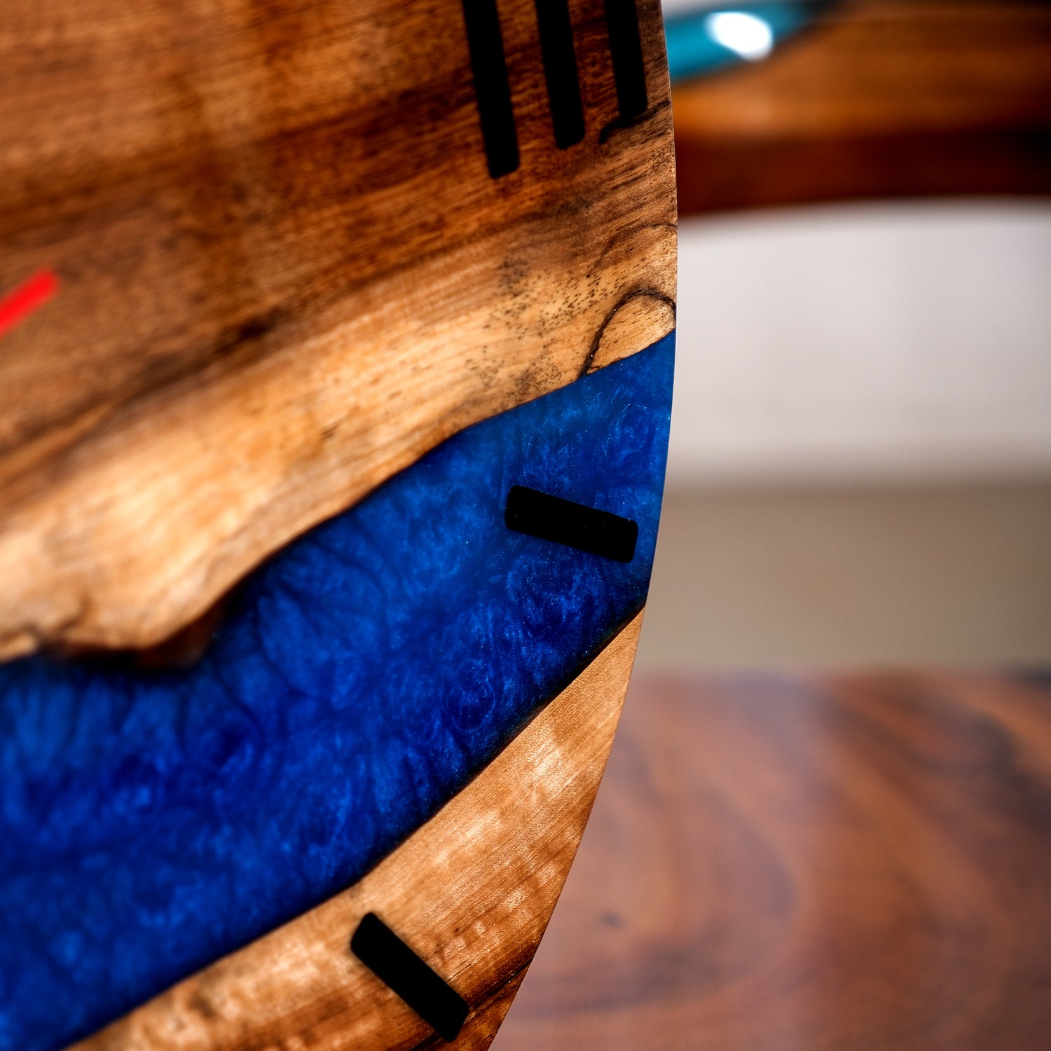 Each clock is meticulously handcrafted using natural wood, showcasing its distinctive grain patterns, combined with vibrant epoxy resin that creates a truly individual piece of functional art.