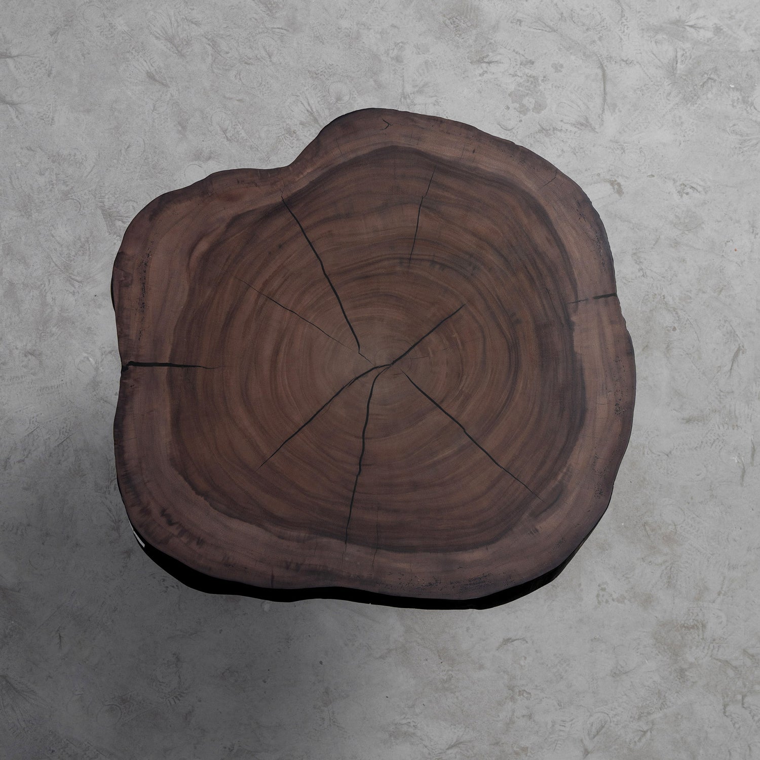 The coffee table showcases a natural and organic pattern inherent to black walnut wood. Crafted from a single slice of black walnut, it prominently displays the tree’s concentric growth rings, which tell the story of the tree’s age and growth over time. The live edge (the natural, uncut perimeter of the wood slice) preserves the raw, irregular contour of the tree trunk, adding a rustic and authentic touch. The wood’s rich, dark-brown hues and the subtle variations in its grain pattern create a visually appealing, nature-inspired design, as if a piece of the forest has been brought indoors.