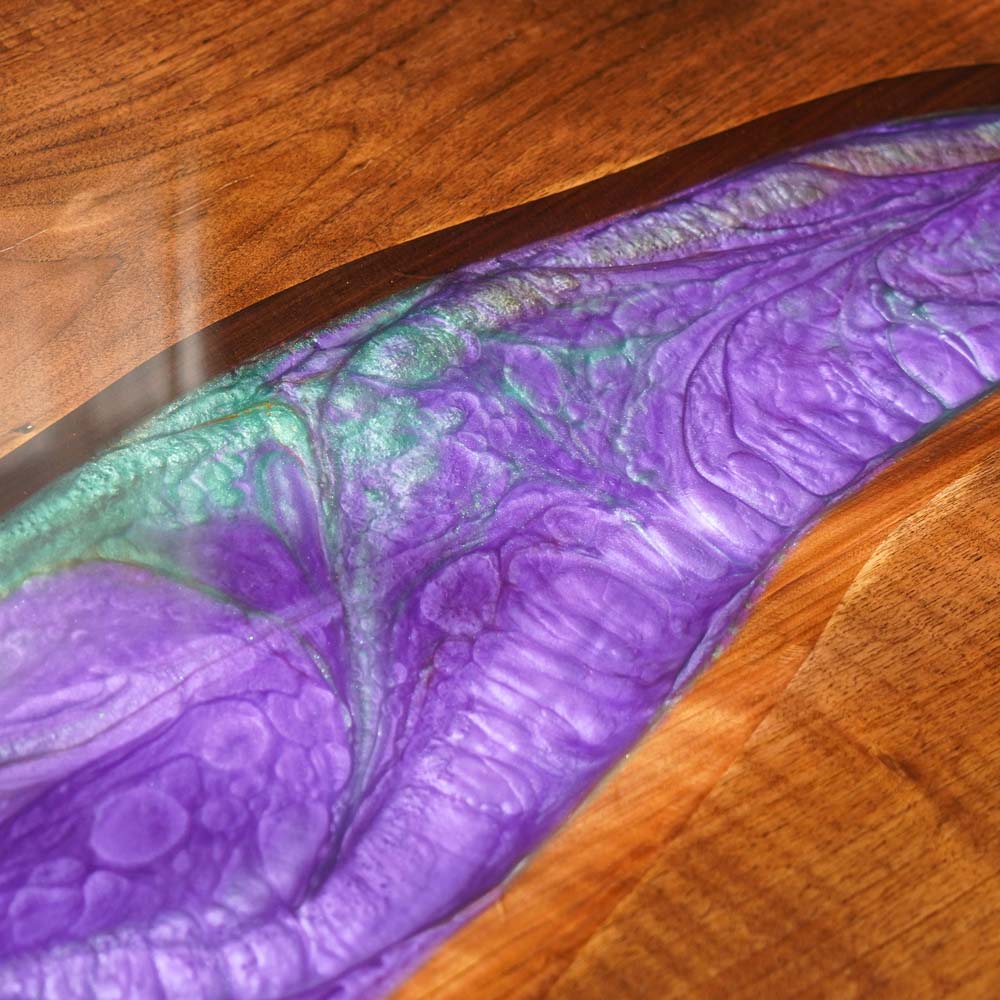 The tabletop presents a vibrant and artistic pattern. Pieces of black walnut wood, with their rich, dark brown tones and natural, flowing grain patterns, are the main elements. These wood sections are combined with Purple Vine Stream resin epoxy, which features a beautiful blend of purple and green colors. The resin has a smooth and glossy finish, creating a striking contrast with the textured surface of the black walnut wood. The purple and green colors in the resin form dynamic, stream-like patterns that give the impression of a flowing vine stream, blending the natural beauty of the black walnut wood with the vibrant and lively feel of the resin.