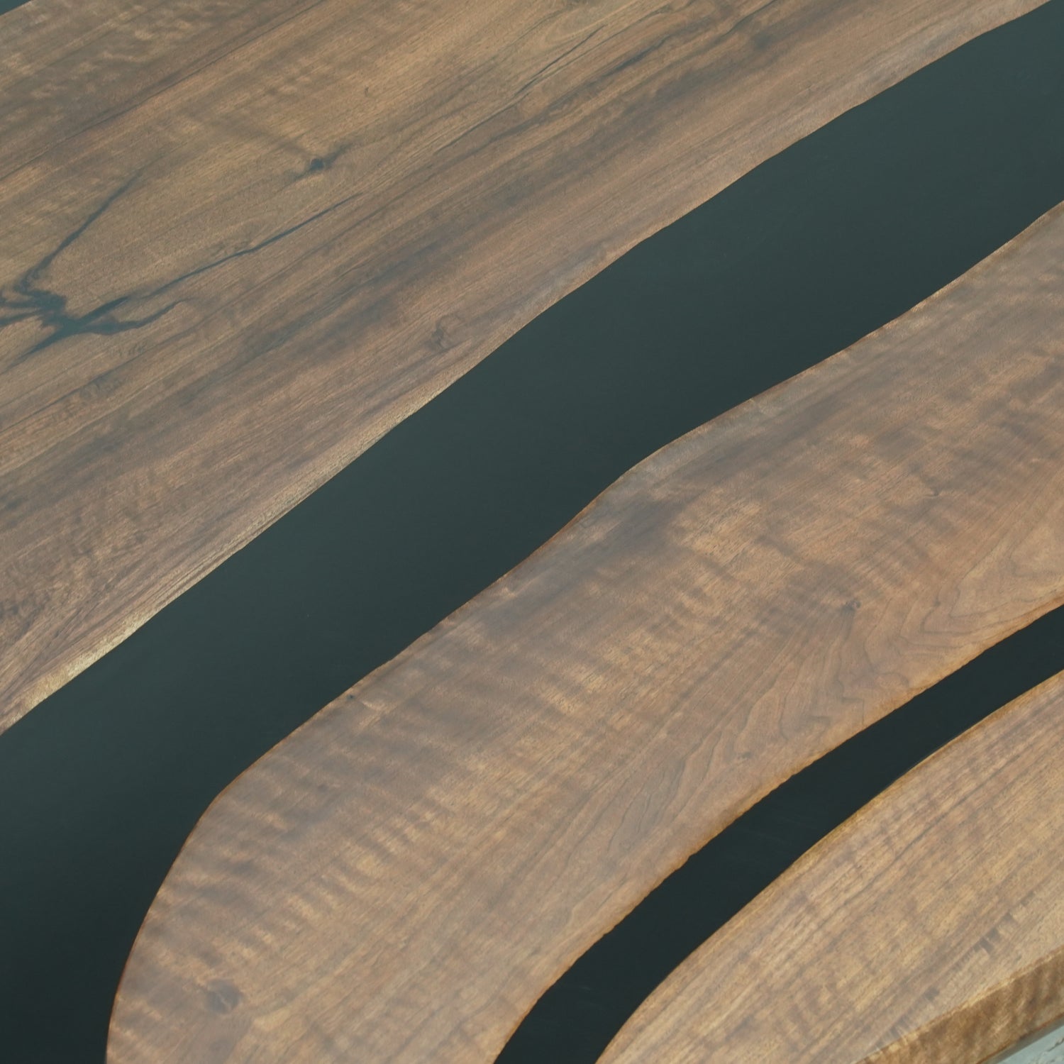 This enchanting black walnut resin table showcases a sumptuous wooden surface, where the natural grain patterns are a testament to the beauty of the wood. It's a popular pick for those searching for a epoxy wood slab table that offer a contemporary design.