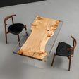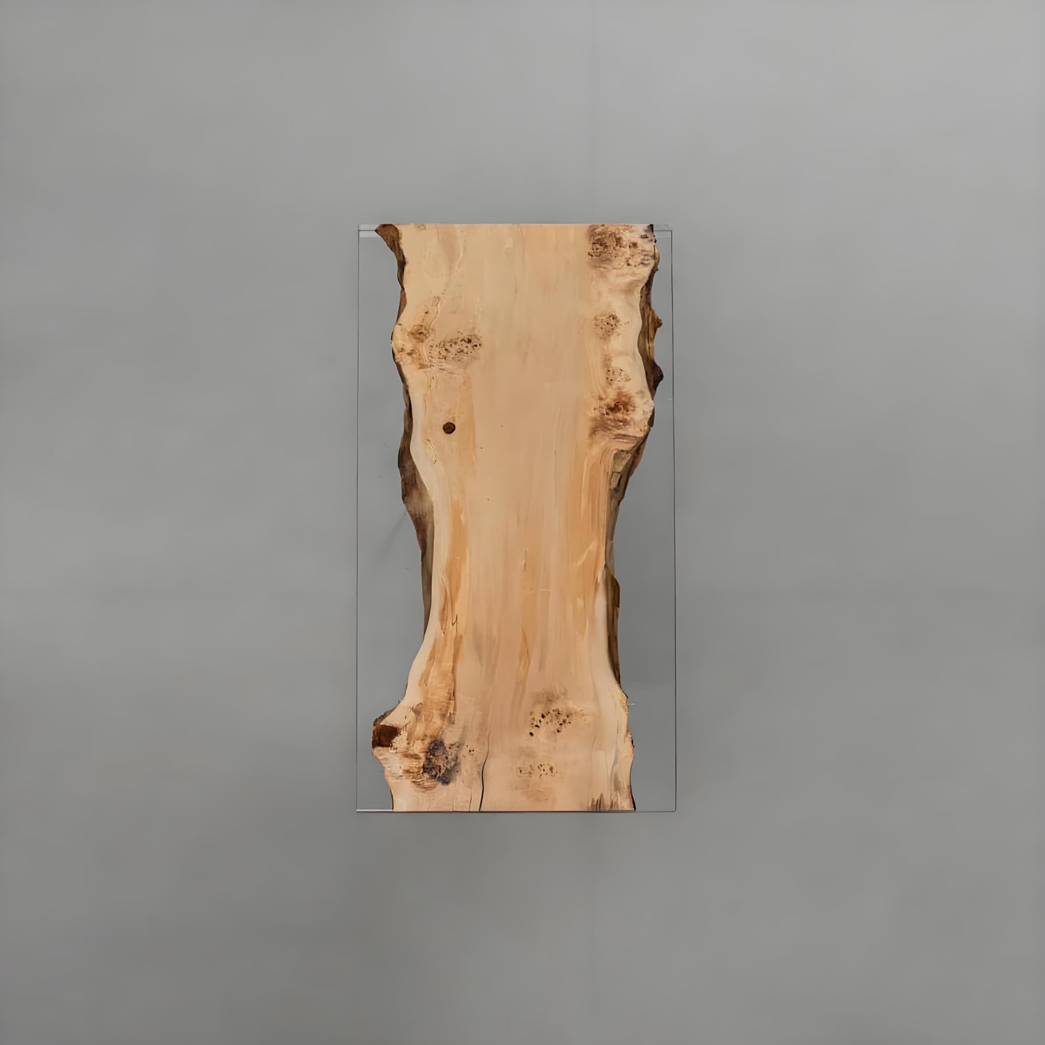 This dining table features a minimalist yet striking pattern. A slab of poplar wood with straight edges takes center stage, showcasing its light, natural wood tones and subtle, flowing grain patterns. Encasing the poplar is clear transparent resin, forming a sleek, glossy border. The resin contrasts with the wood’s textured, organic surface, making the poplar appear to “float” within a glass - like frame. This design highlights the wood’s understated beauty while adding a contemporary, polished touch, blending rustic simplicity with modern elegance.