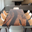 The unique wood texture and the collision of black resin of this epoxy tabletop form an abstract work of art. It's a popular pick for those searching for a black epoxy dining table that offer a blend of traditional and contemporary design.