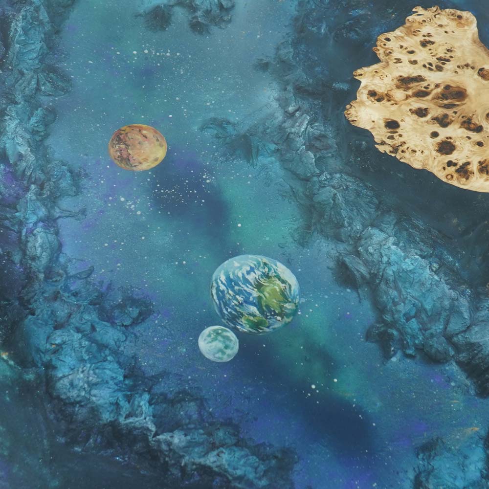 The tabletop showcases a mesmerizing pattern. Pieces of poplar wood, with their light - colored, natural, and slightly textured surfaces, are embedded in Stellar Abyss Roam epoxy resin. The resin features a deep, rich blue base color, reminiscent of the vastness of space, interspersed with hints of purple and other cosmic - like hues. The irregular shapes of the poplar wood, with their unique grain patterns and knotty textures, contrast beautifully against the smooth, glossy expanse of the epoxy resin. Together, they create a visual effect that evokes the mystery and wonder of a celestial landscape, as if one is gazing into a deep, star - filled abyss.