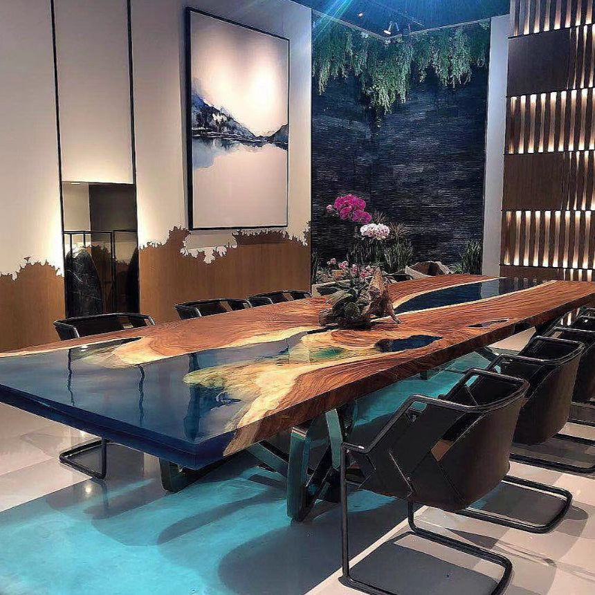 The expansive live edge wooden surface of this luxury table, filled with a deep blue epoxy resin that resembles a serene body of water, is truly captivating. The combination of the natural wood and the resin creates a visually stunning effect, making it a piece of art for any space.