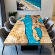 This premium peacock blue epoxy dining table is the epitome of luxury. The rich peacock blue epoxy resin contrasts exquisitely with the wood, creating a high-end look that appeals to those seeking premium epoxy resin dining tables. This table is designed for upscale dining spaces, offering not only unparalleled style but also durability. It's a popular choice for those who desire luxury dining table with epoxy resin that stands out for its elegance and craftsmanship.