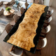 Crafted from straight - edge poplar with warm natural tones and unique grain patterns, this dining table features black resin inlays. The glossy resin forms sleek patches on the wood, creating a striking contrast. It combines organic charm with modern style, serving as a functional and eye - catching centerpiece for dining spaces.