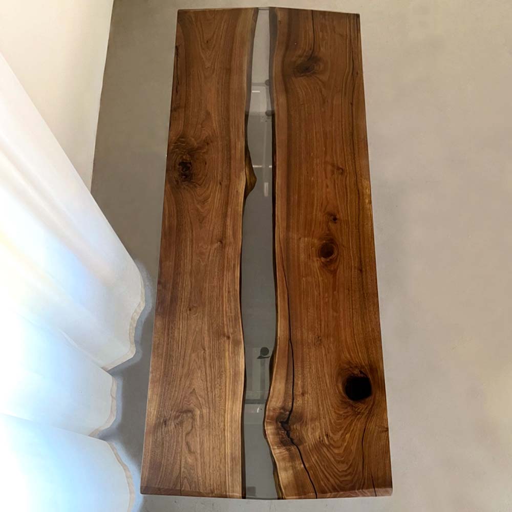 The tabletop has a simple yet elegant design. Two pieces of black walnut wood, each with their own deep brown color and beautiful, natural grain patterns, are placed on either side. In the middle, a strip of transparent epoxy resin connects the two wooden pieces. The resin is clear and smooth, allowing the eye to focus on the rich textures and colors of the black walnut wood. This design creates a balanced and harmonious look, highlighting the natural beauty of the wood while using the resin as a subtle yet effective connecting element.
