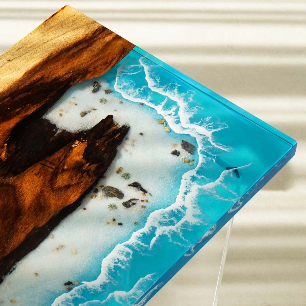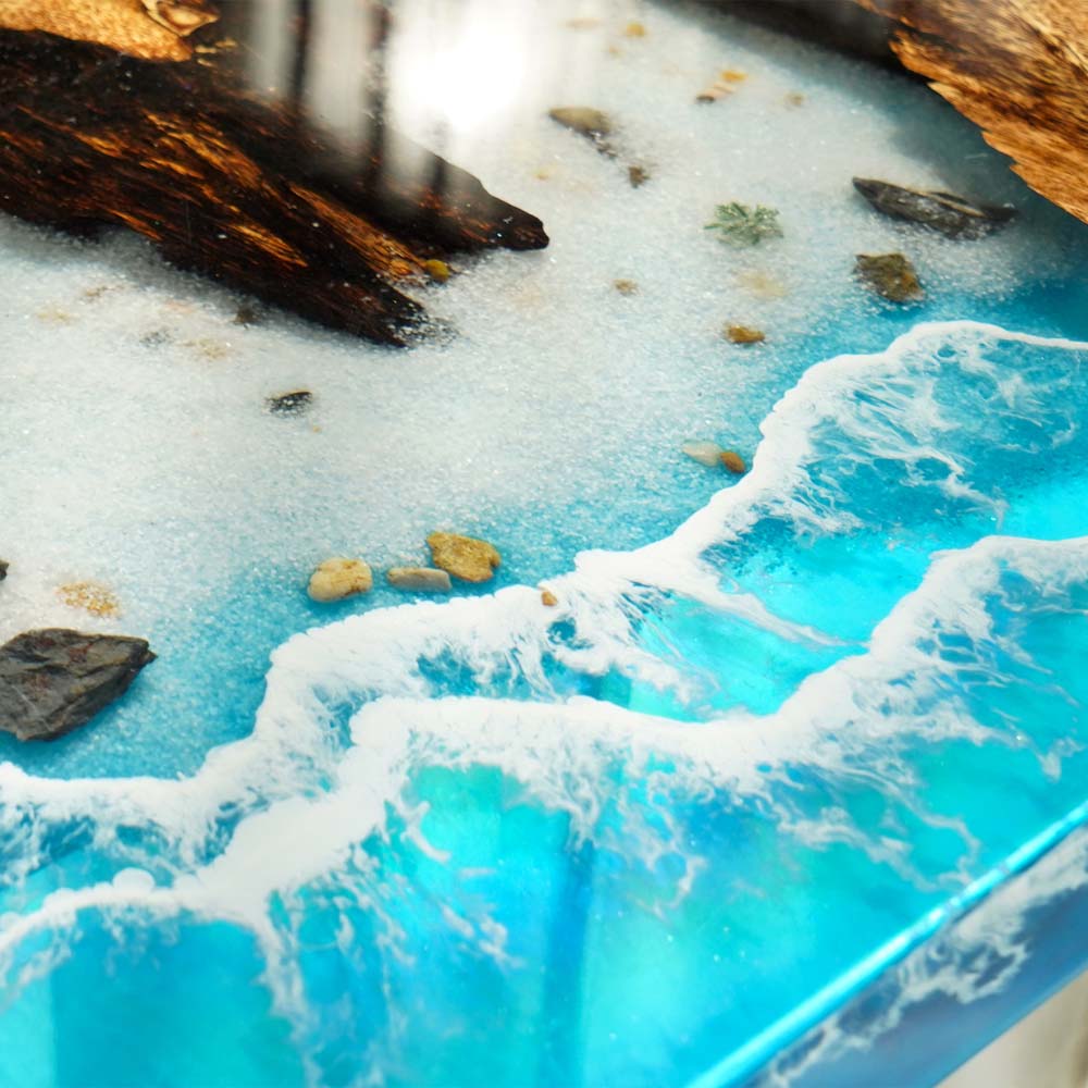 Nature and art elements are seamlessly integrated, with one side of the desktop featuring a walnut wood panel showcasing its deep brown tones and intricate wood grain patterns, reminiscent of a rugged coastline. The blue-toned epoxy resin simulates a coastal landscape, while meticulously carved white details evoke the crashing waves. The resin also incorporates tiny details, such as elements resembling pebbles or small stones, further enhancing the realism of the coastal scene. The contrast between the warm, organic texture of the walnut wood and the cool, smooth surface of the blue and white resin creates a striking visual effect, as if freezing the boundary between land and sea and presenting it eternally on the tabletop.