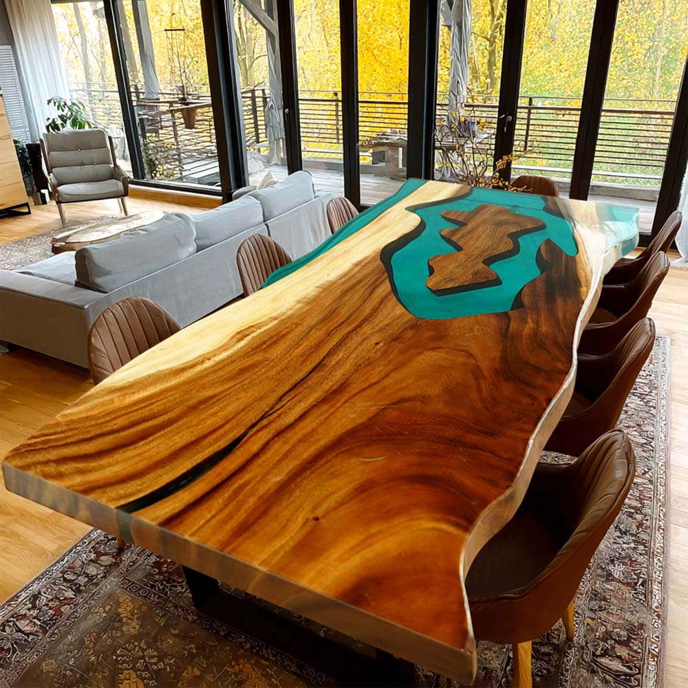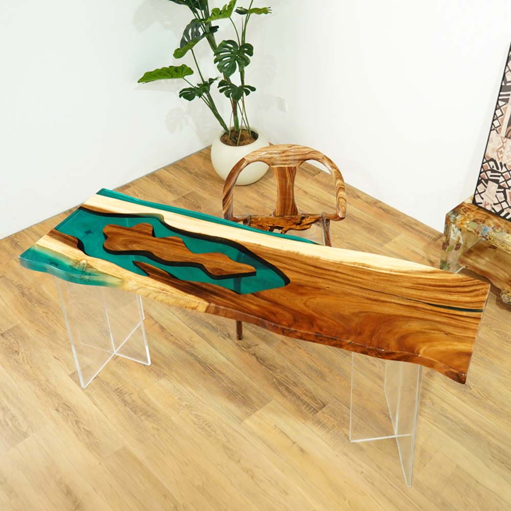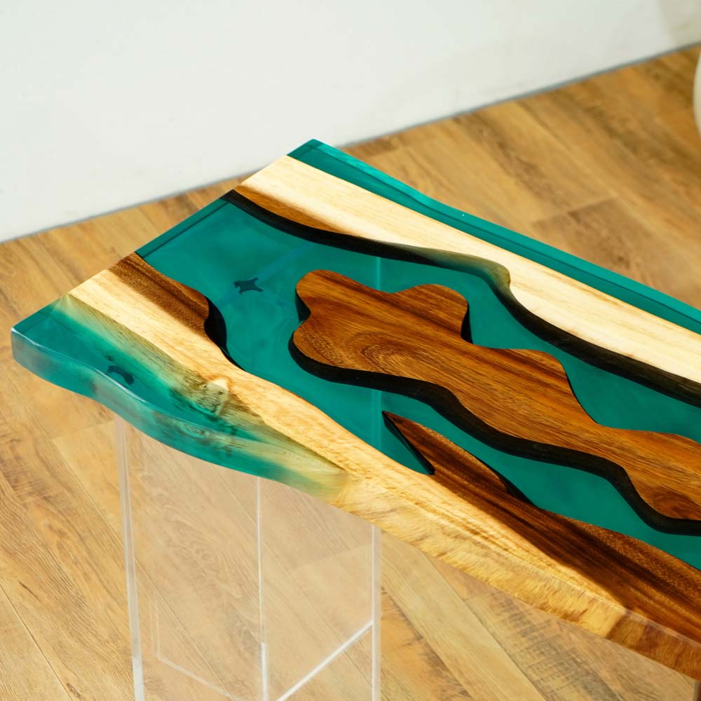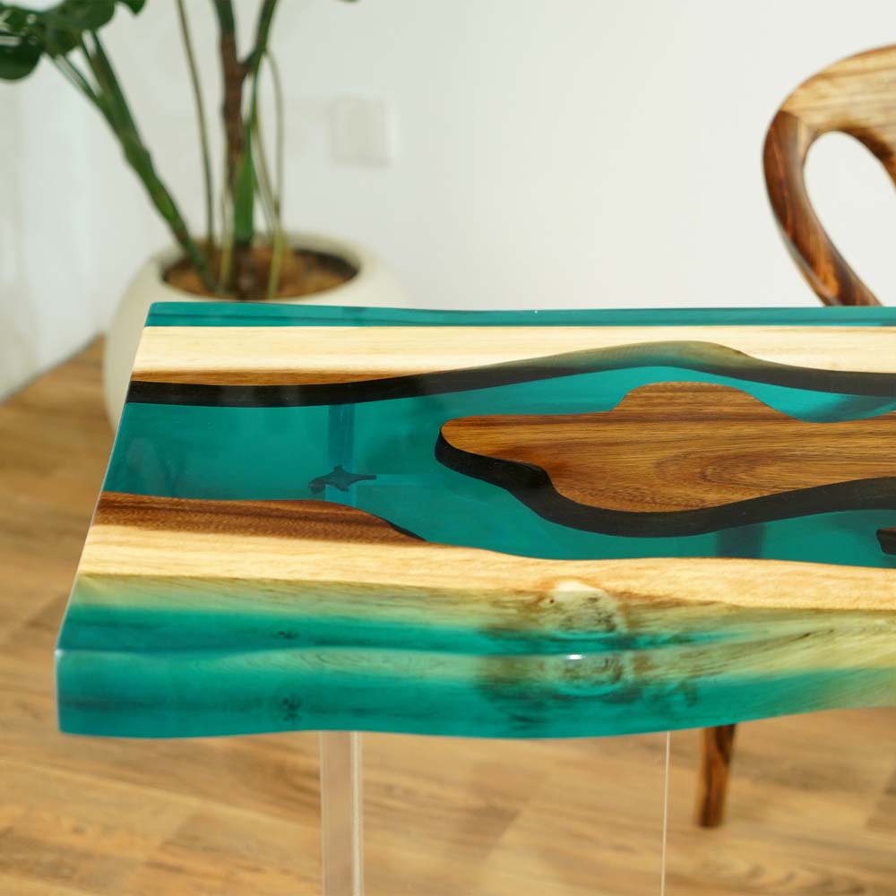 The tabletop features a captivating pattern. Pieces of walnut wood, with their rich, warm brown tones and natural, flowing grain patterns, are integrated with Transparent Lake Green epoxy resin. The resin fills the gaps between the walnut wood sections, creating a smooth, glass - like surface. The green color of the resin resembles the hue of a lake, and its transparency allows the viewer to see through to the underlying structure, enhancing the depth of the design. The irregular shapes of the walnut wood and the lake - green resin form a pattern that evokes the image of a natural landscape, perhaps a river or lake winding through a forest, blending the organic beauty of the walnut wood with the fresh and vibrant feel of the Transparent Lake Green epoxy resin.