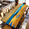 The tabletop features a fascinating pattern. The rich, warm - toned walnut wood serves as the main body, showcasing its natural grain and texture. Interspersed within the walnut wood is Wood - Stream Stones epoxy resin, which is designed to mimic a flowing stream. The blue resin represents the water, with detailed patterns that look like rippling waves. Inside the "stream," there are elements resembling stones, adding to the realism of the scene. Additionally, smaller patches of blue resin are scattered across the walnut wood, as if small tributaries or splashes, enhancing the overall effect of a natural waterway meandering through a wooden landscape.