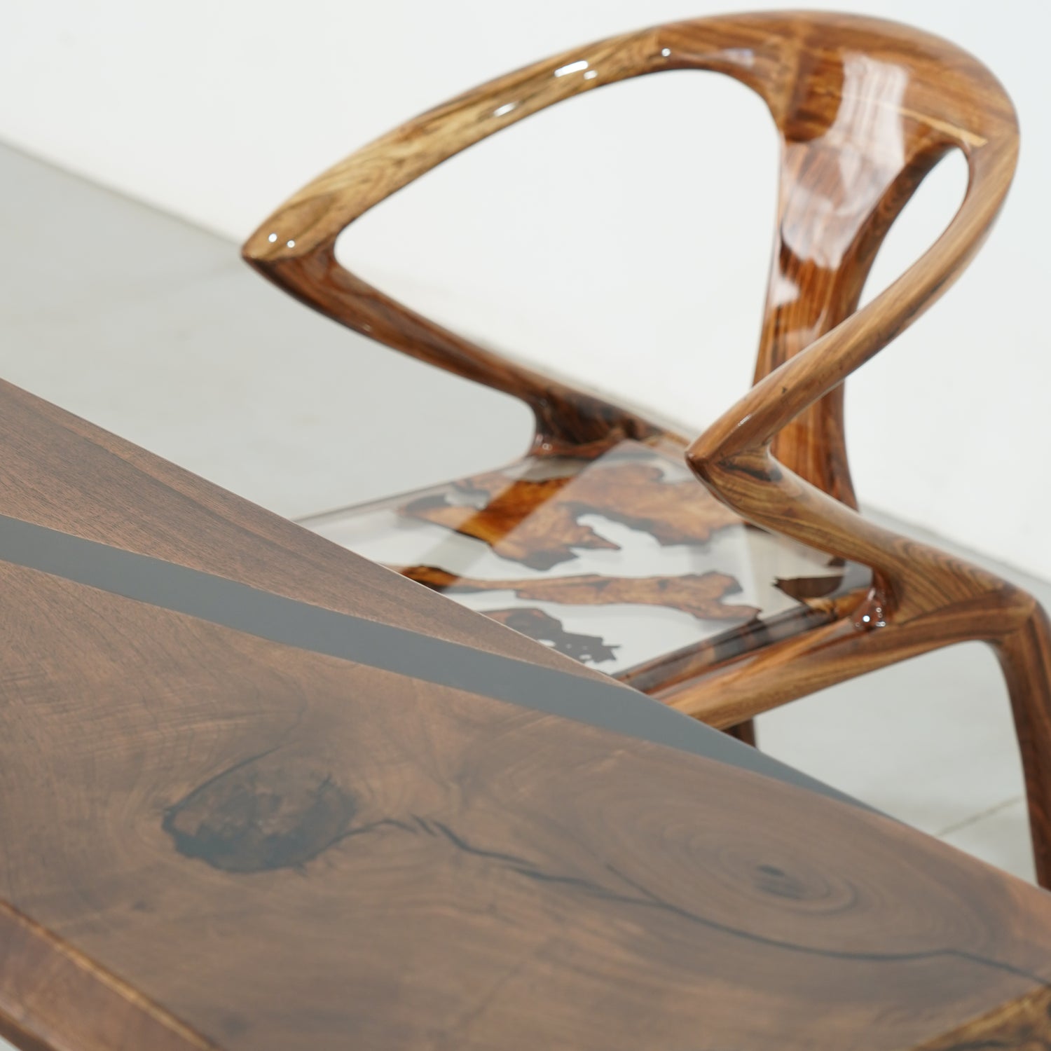 This Custom Black Walnut Dining Table with Black Resin showcases a refined design where a narrow, dark resin strip meanders along the length of the wooden surface. The unique pattern formed by the resin and wood makes it a standout piece, highly sought after for unique epoxy resin dining table designs. It's not just a piece of furniture but a statement of style, perfect for those looking for custom epoxy resin dining tables that can transform their dining space into a haven of elegance.