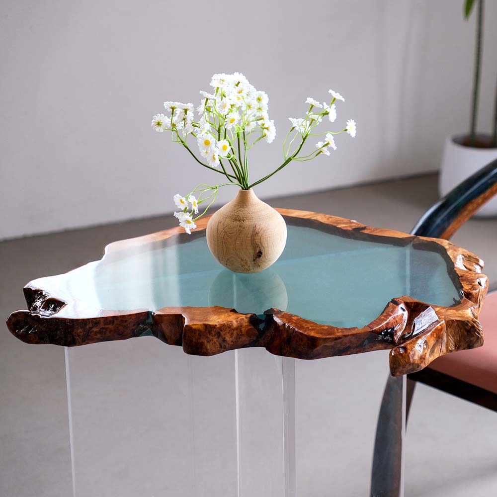This coffee table showcases a unique pattern. The irregularly - shaped Golden Camphor wood, with its rich, warm - toned and textured grain, forms the outer frame. Inside, transparent epoxy fills the space, creating a striking contrast. The natural, organic edges of the Golden Camphor wood juxtapose with the smooth, clear surface of the epoxy, resulting in a pattern that blends the rustic charm of the wood with the modern sleekness of the epoxy resin , like a natural - formed frame embracing a transparent world.