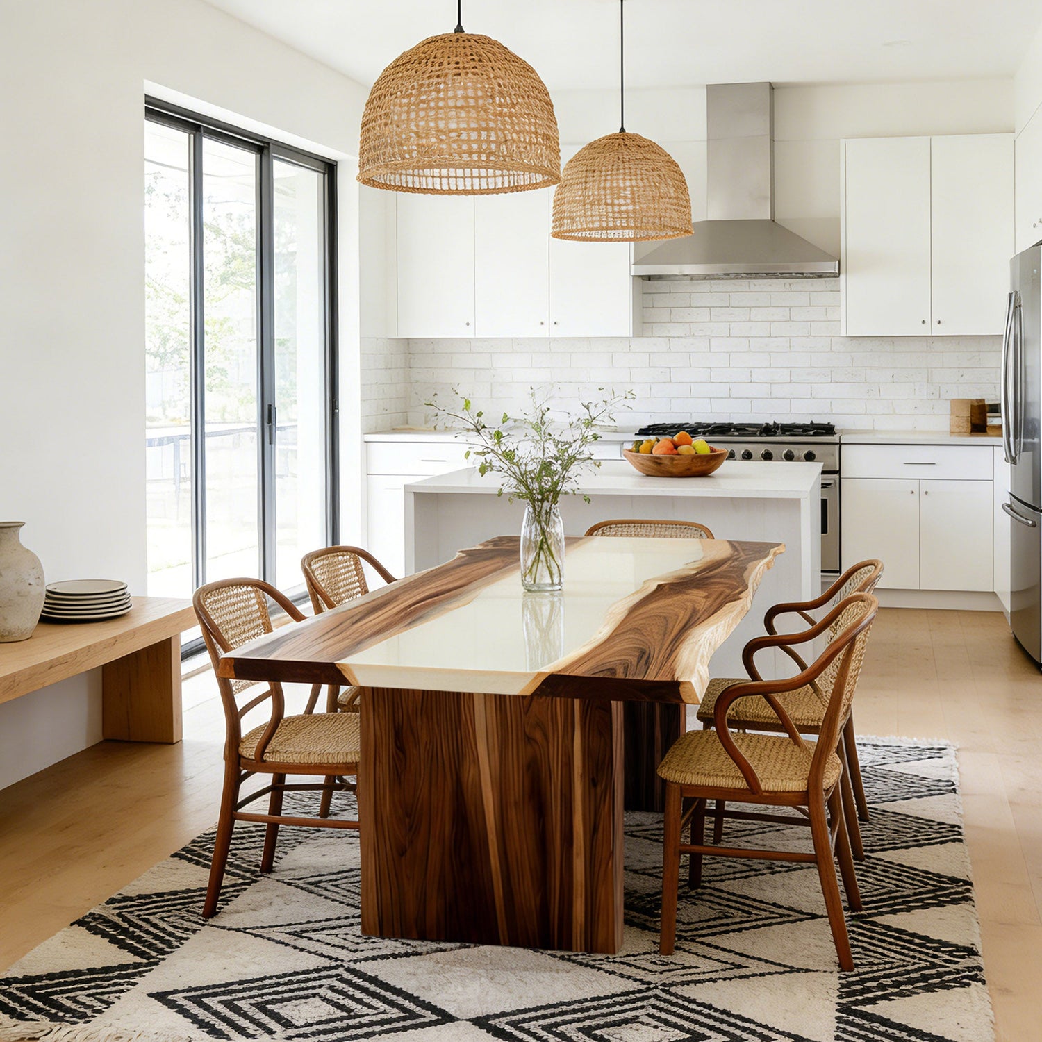 The Elite Walnut White Epoxy Resin Dining Table is handcrafted from solid walnut wood and soft white epoxy resin, creating a refined balance between natural warmth and modern simplicity.