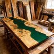 Made from high-quality poplar wood, this epoxy resin dining table features a deep green resin river inspired by nature. It’s perfect for bright interiors, modern homes, and creative dining spaces.
