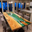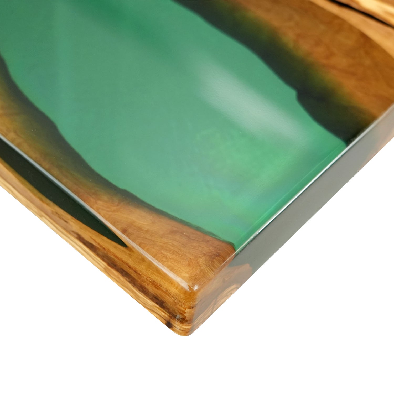 Crafted from straight-edge olive wood, this dining table showcases warm natural tones and distinctive grain patterns, creating an organic foundation that exudes rustic charm. Integrated within the wood is a flowing green resin inlay, meticulously designed to emulate a serene woodland stream. The glossy, translucent resin captures the gentle movement of water with subtle ripples and soft curves, enhancing the sense of a natural creek meandering through the wooden landscape. This vibrant green element contrasts elegantly with the textured olive wood, drawing attention to the unique knots and grain variations. The harmonious combination of earthy olive wood and lifelike resin creates a tranquil yet visually engaging tablescape—blending rustic warmth with artistic fluidity to form a functional centerpiece that brings the calm beauty of nature into everyday living.